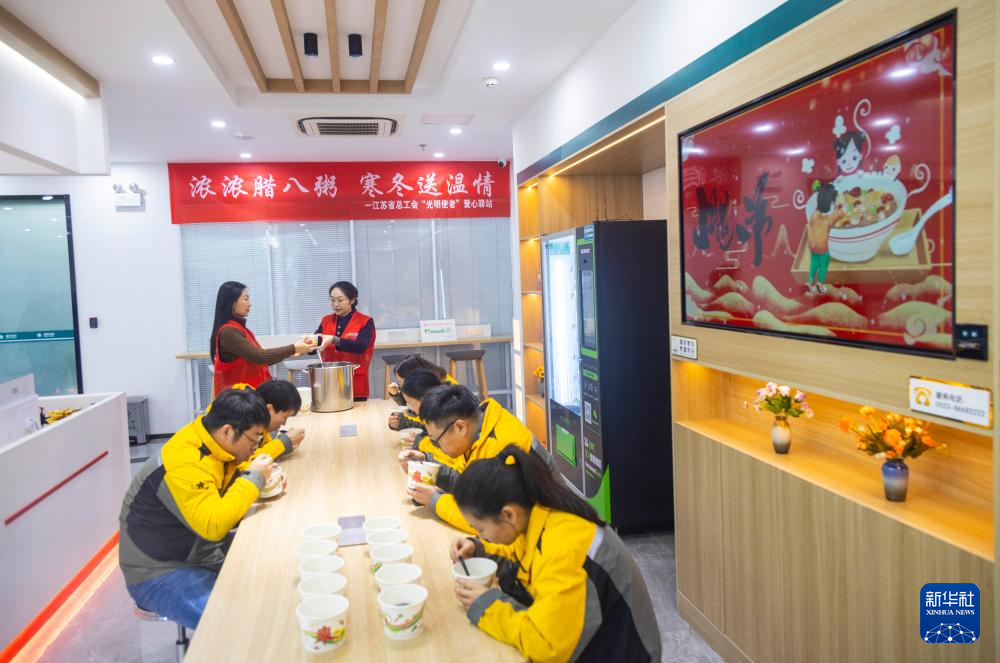 1月18日,志愿者在江苏省泰州市海陵区一爱心驿站为快递员盛腊八粥。