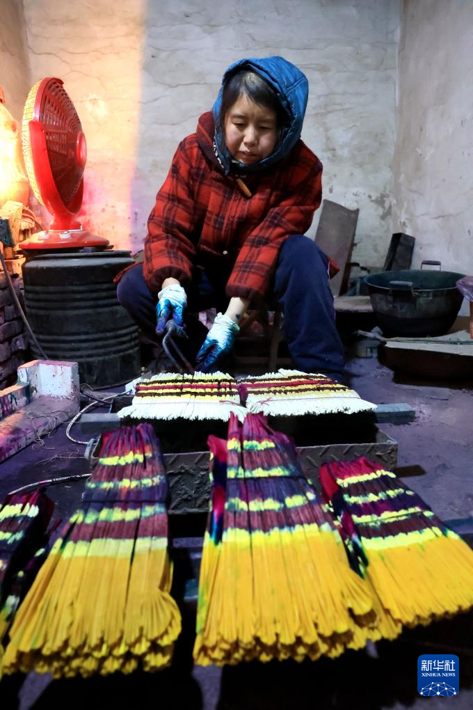 1月24日,在石家庄市栾城区邵家庄村,手工艺人在晾晒彩子。