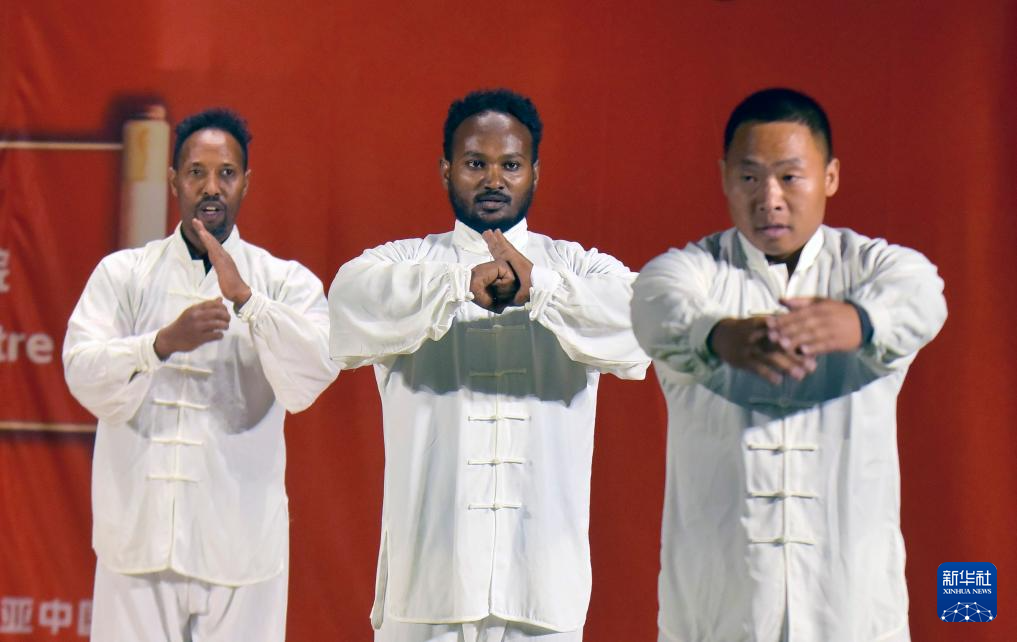 1月23日,在埃塞俄比亚首都亚的斯亚贝巴国家剧院,当地演员与中国演员一同表演中国武术。