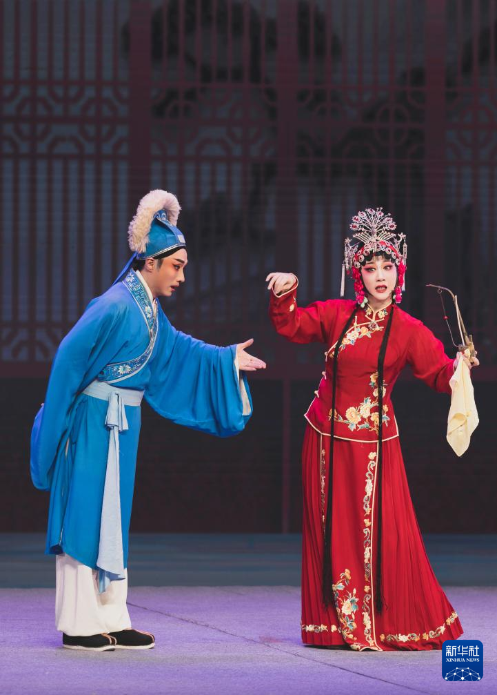 中国戏剧梅花奖获得者陈琼(右)在《王莲莲拜香》选段的表演中(2月5日摄)。