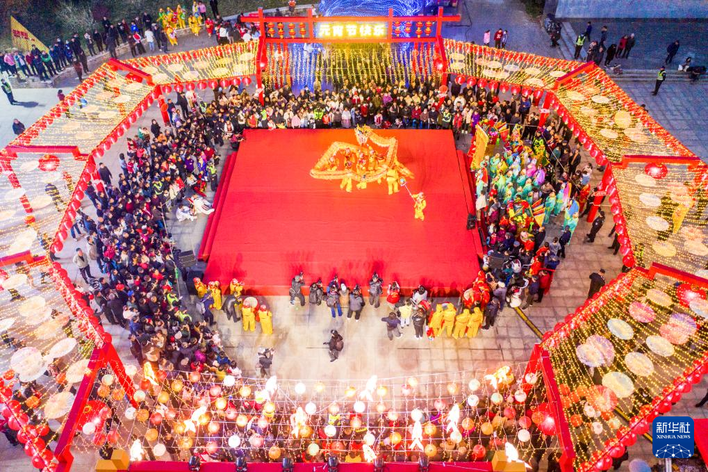 2月18日晚,湖南省永州市江华瑶族自治县图腾园广场,人们在参加龙狮灯会舞龙表演(无人机照片)。