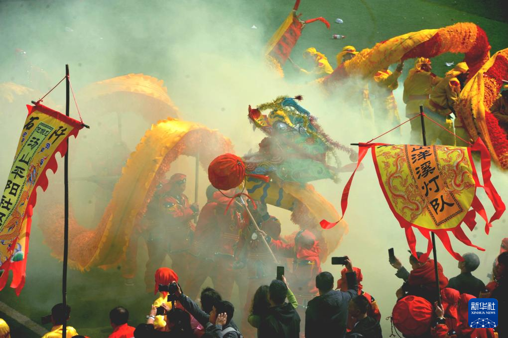 2月19日,在浙江省宁波市北仑区柴桥街道,艺人在舞龙展演(无人机照片)。