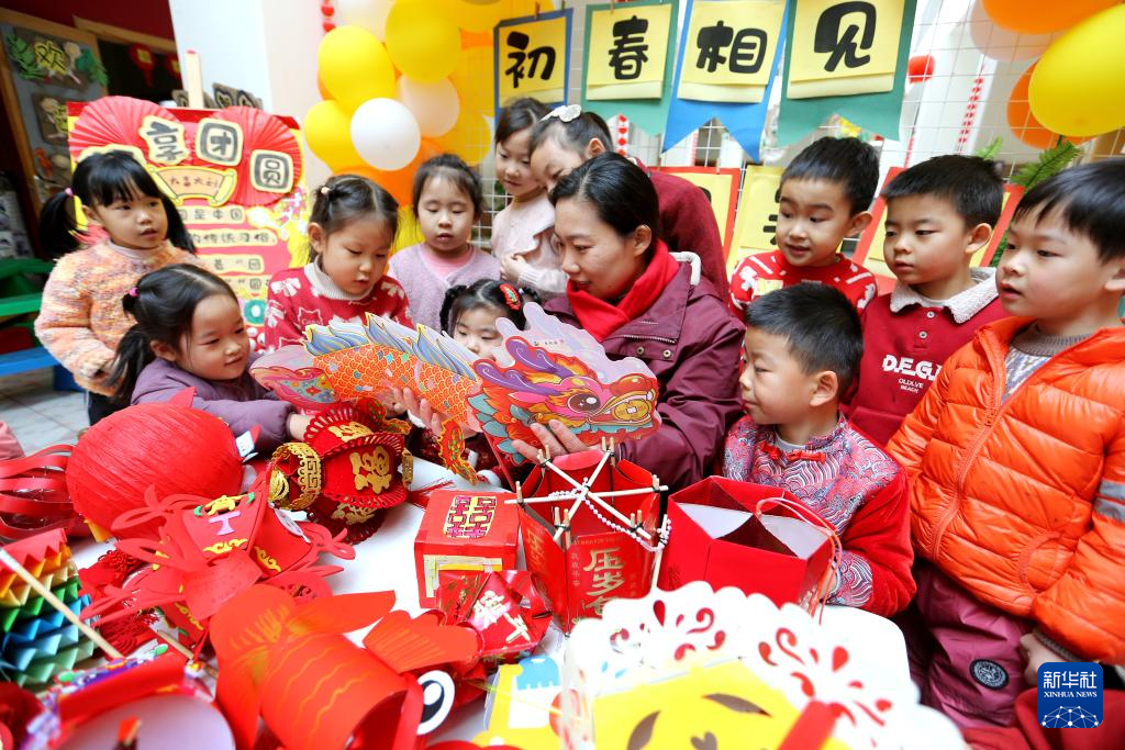 2月22日,在江苏省连云港市一家幼儿园,老师指导小朋友制做元宵花灯。