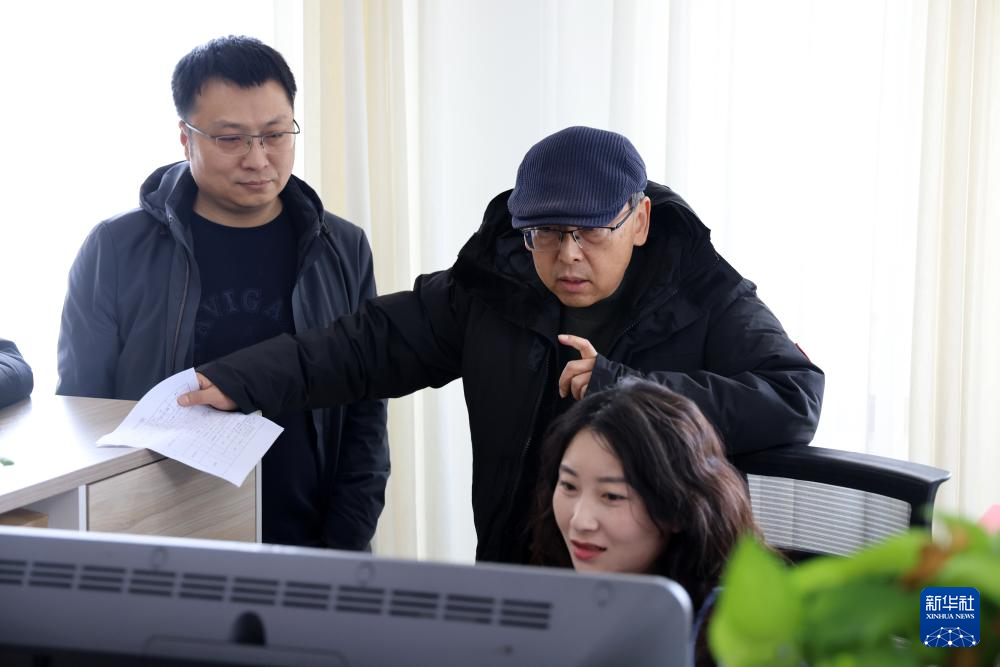 在云冈研究院数字化保护中心,杭侃(中)和同事交流云冈石窟数字化技术采集方案(2023年12月29日摄)。