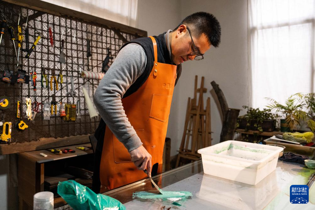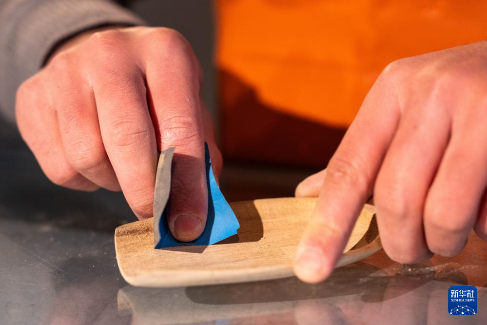 2月28日,郝冠雄在擦漆,为的是让大漆充分渗透到木胎里。