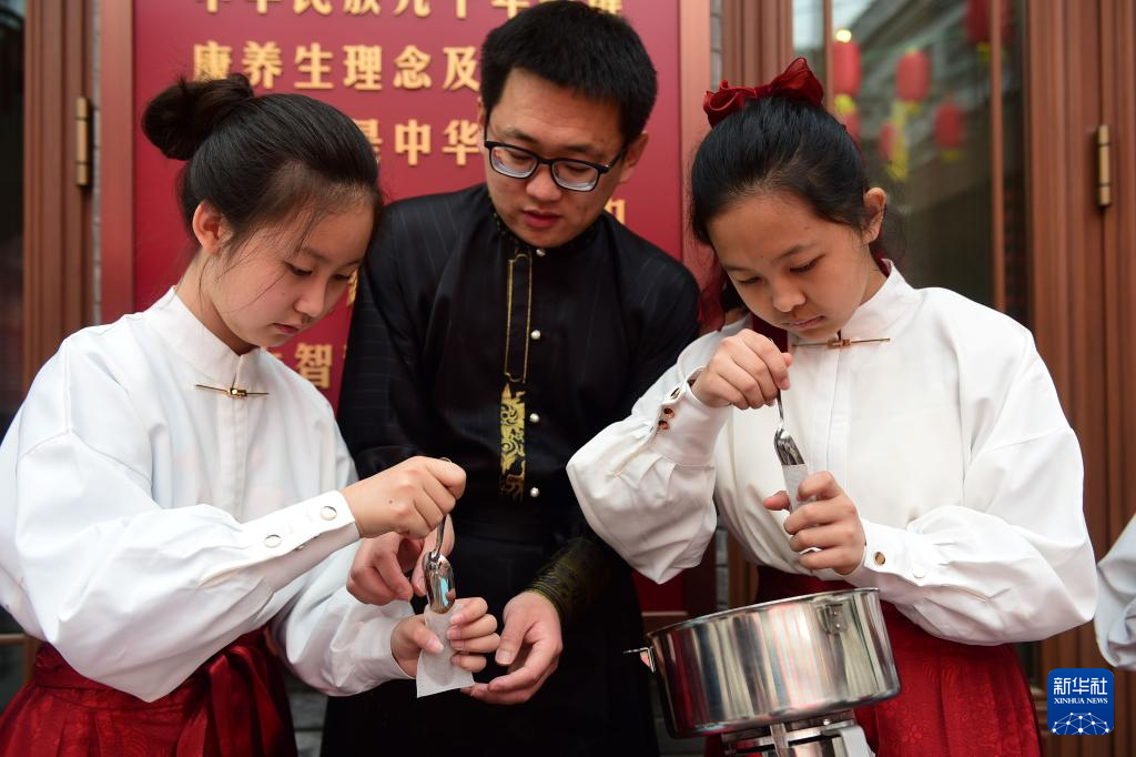 3月28日,参加公益研学活动的学生在沧州中西医结合医院南川老街国医堂学做中药香囊。