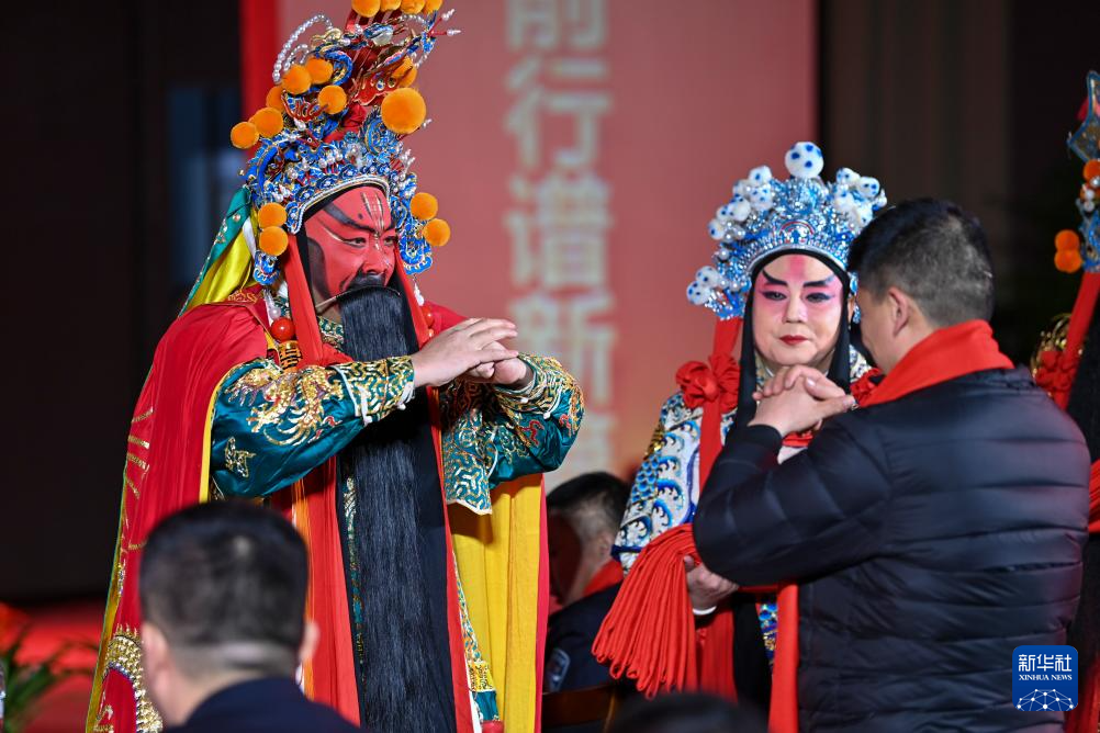 在山西省太原市迎泽区的一场警民联欢会上,武凌云(左)和观众互动(2月2日摄)。