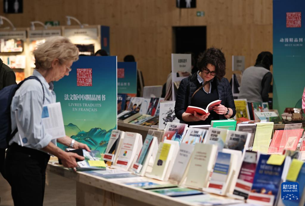 4月12日,人们在法国巴黎临时大皇宫举行的2024巴黎书展上翻阅中国图书。