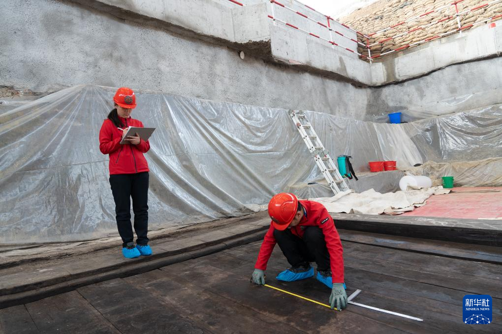 考古人员在武王墩墓测量椁板数据(2024年3月16日摄)。