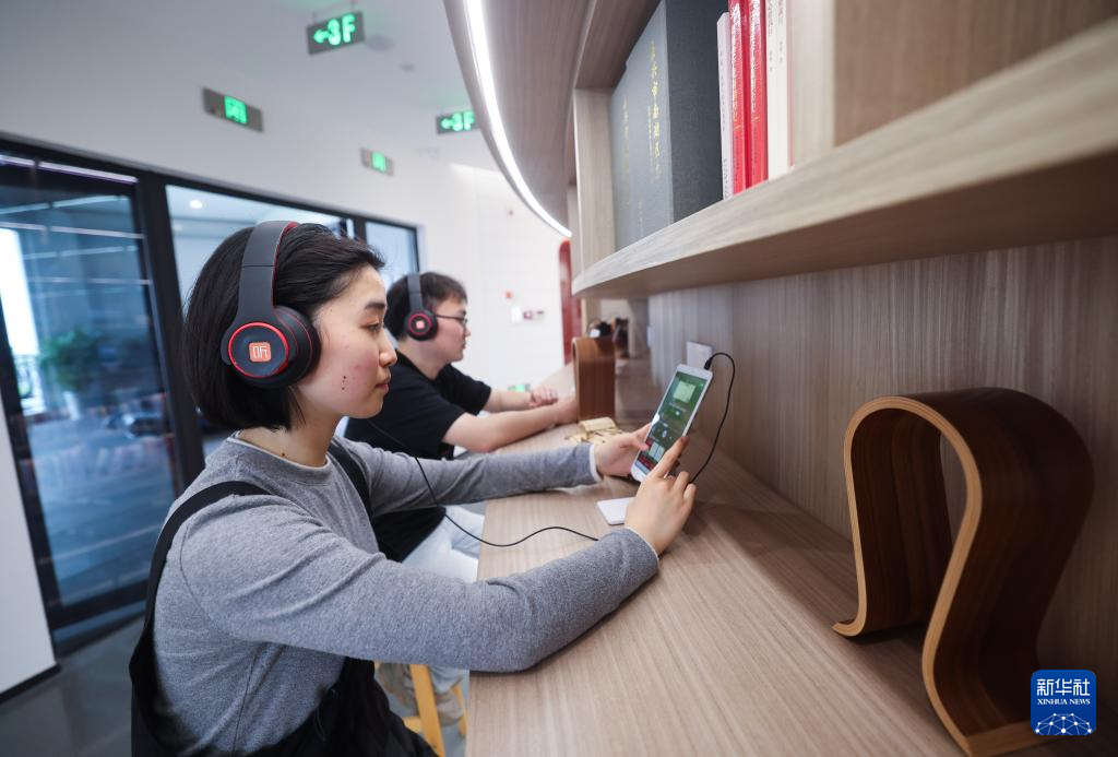 4月16日,在嘉兴市南湖区新时代文明实践中心,读者依托数字化设备听“有声读物”。
