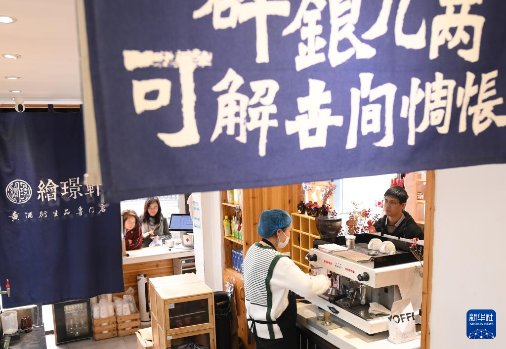 2月20日,仓桥直街一家店铺的店员在指导游客购买黄酒咖啡。