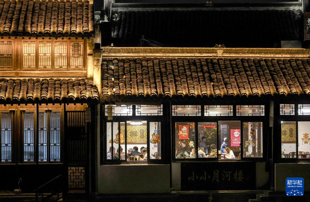 4月25日,顾客在月河历史街区的餐厅里用餐。