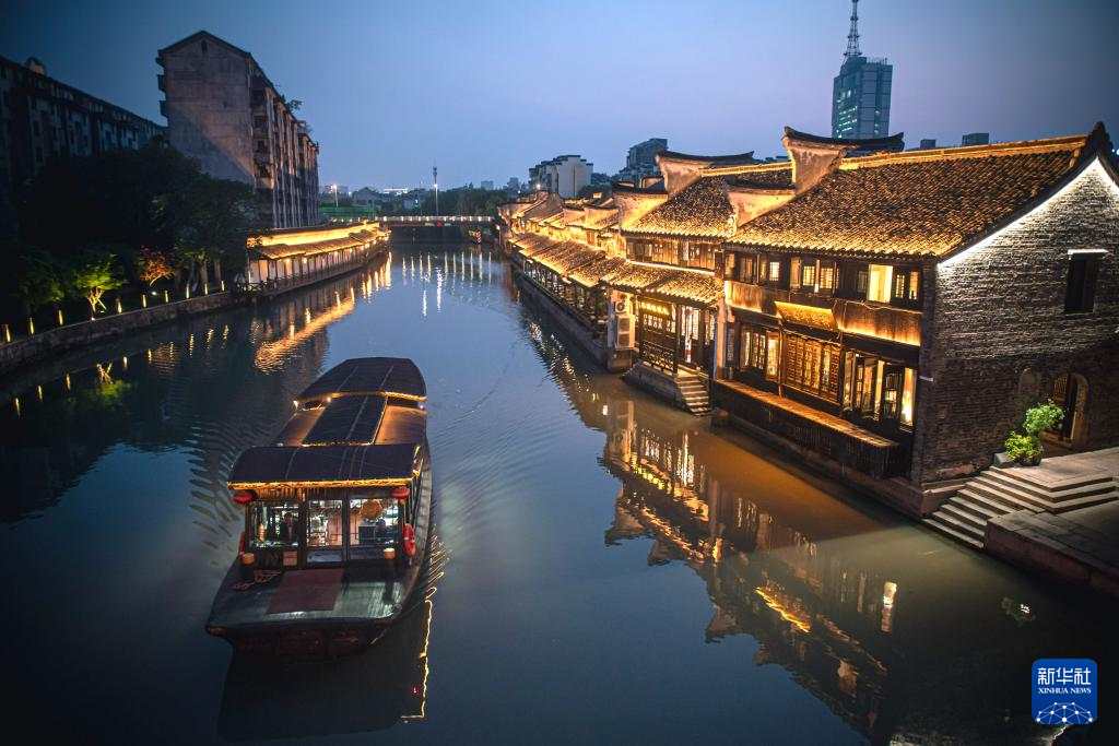 4月26日,游船行驶在流经嘉兴市月河历史街区的京杭大运河上。