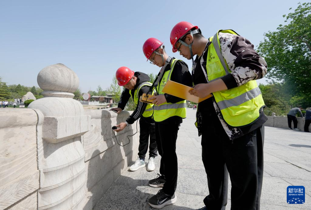 河北省建筑科学研究院有限公司的文物保护技术人员在用仪器检查赵州桥石栏板(4月25日摄)。