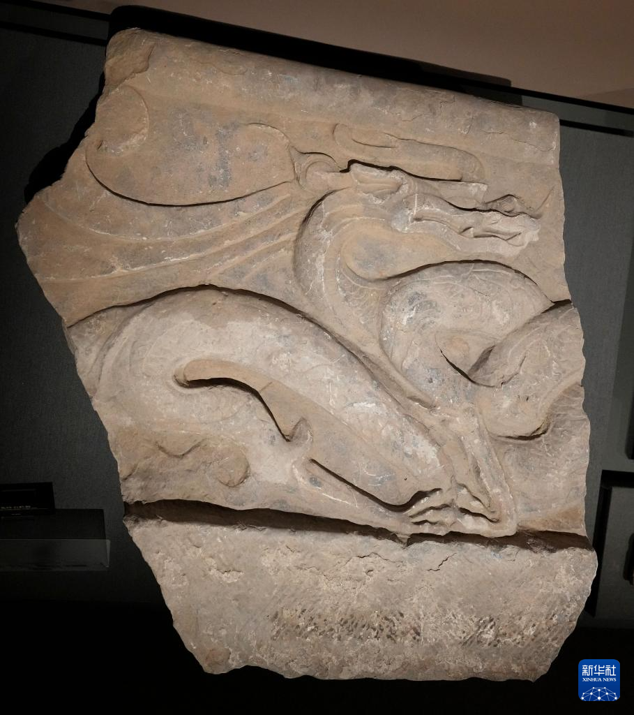 赵县博物馆展出的隋代赵州桥高浮雕龙纹石栏板(4月25日摄)。