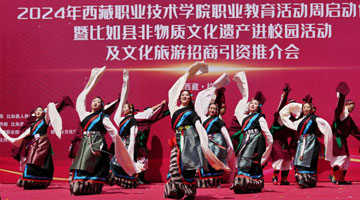 当日,西藏职业技术学院职业教育活动周在拉萨启动,那曲市比如县民族艺术团非物质文化遗产表演暨“乡村振兴 那曲奋进”旅游推介走进校园,激发人们对传统文化和特色旅游的兴趣。