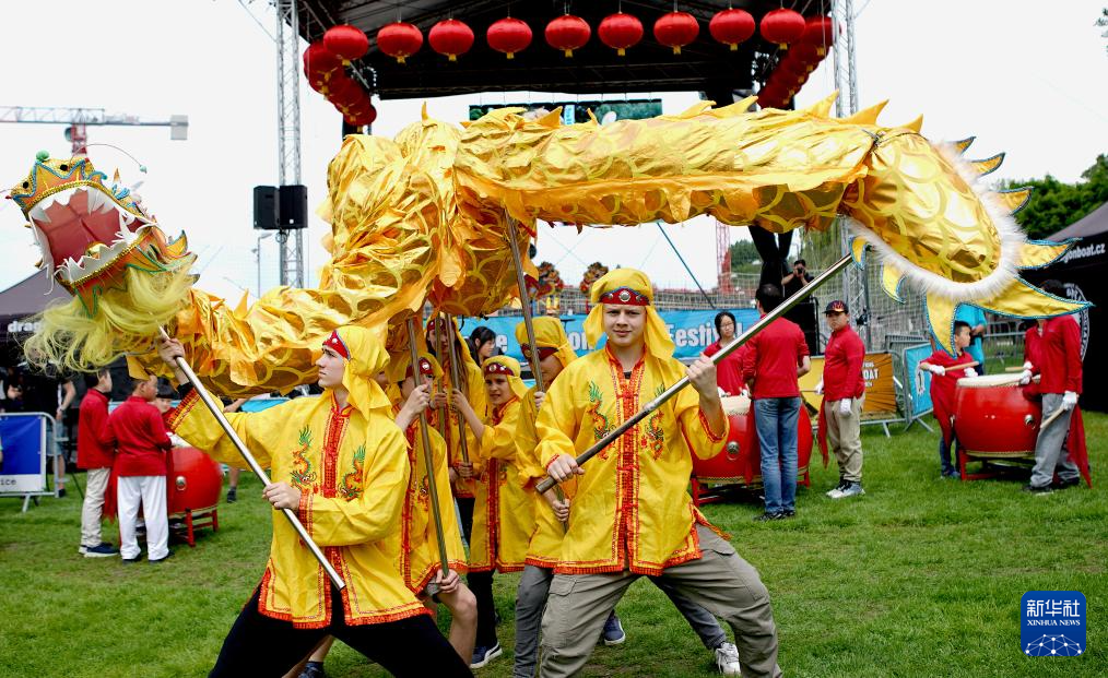 5月11日,在捷克首都布拉格举行的第27届布拉格龙舟节上,捷克青少年表演舞龙。
