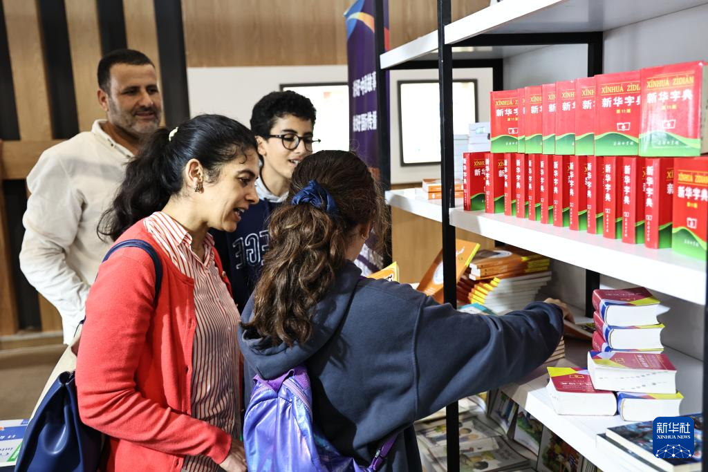 5月11日,人们在摩洛哥拉巴特国际书展的中国展台上选购汉语教材。