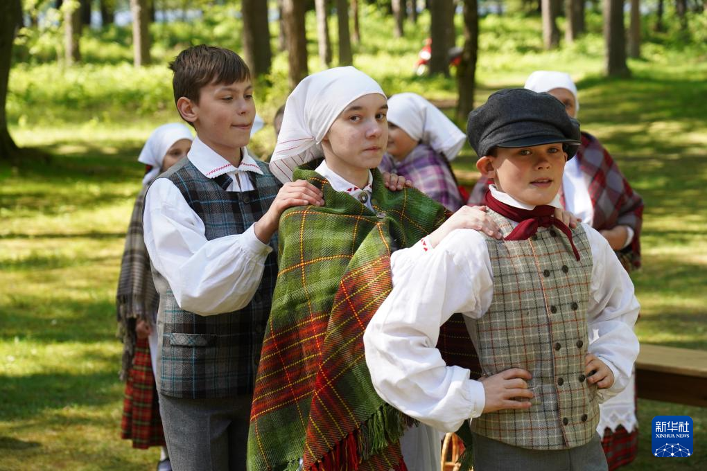 5月11日,在拉脱维亚里加市郊,孩子们在拉脱维亚民族志露天博物馆建馆百年庆祝活动上表演民族舞蹈。
