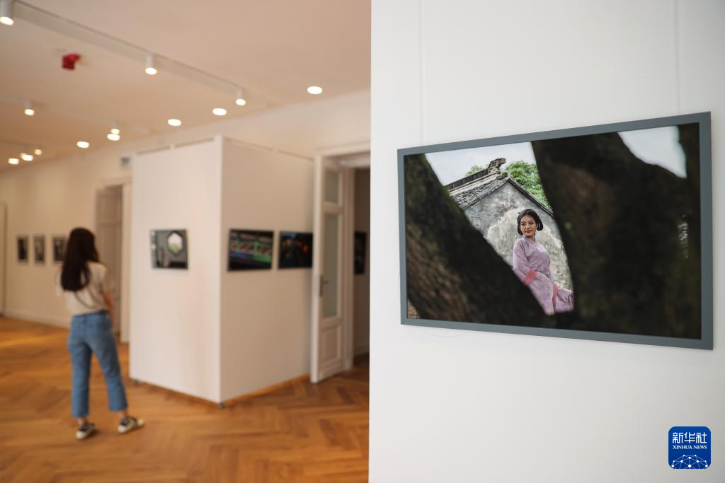 5月6日,一名女士在匈牙利布达佩斯中国文化中心参观摄影展。