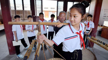 5月19日,小朋友在西安长安十二时辰景区游玩拍照。