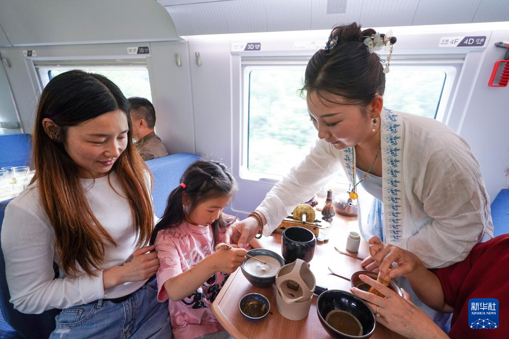 5月20日,南京客运段工作人员(右一)在G2807次高铁列车车厢内进行茶艺表演。