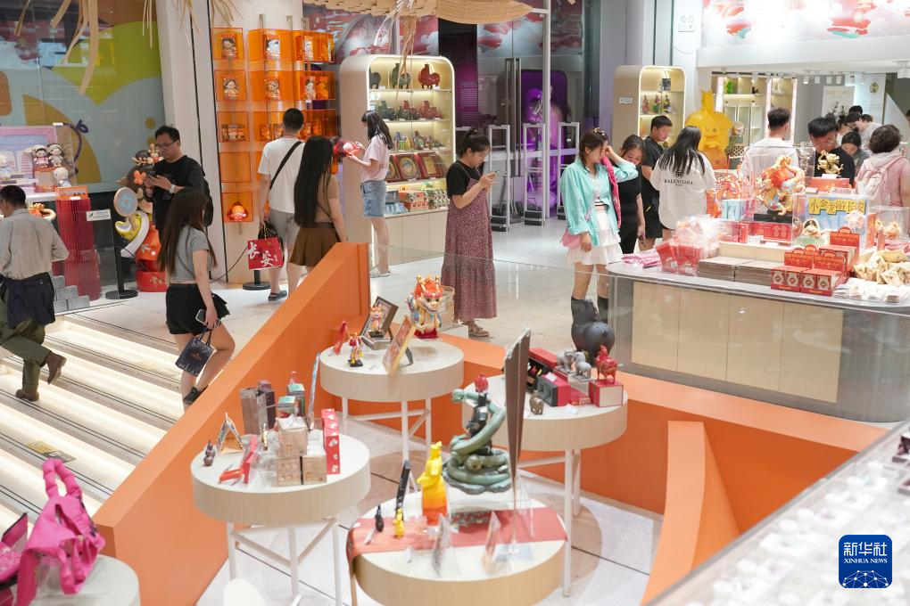 5月20日,游客在西安大唐不夜城景区一家文创产品店内游览选购。