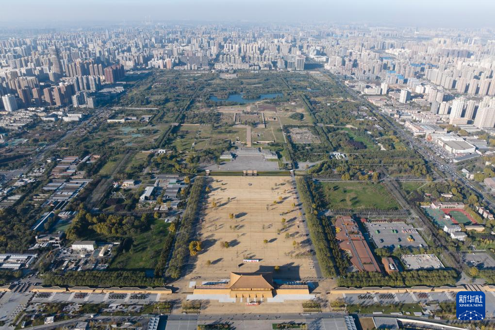 俯瞰西安市大明宫国家遗址公园(2023年11月17日摄,无人机照片)。
