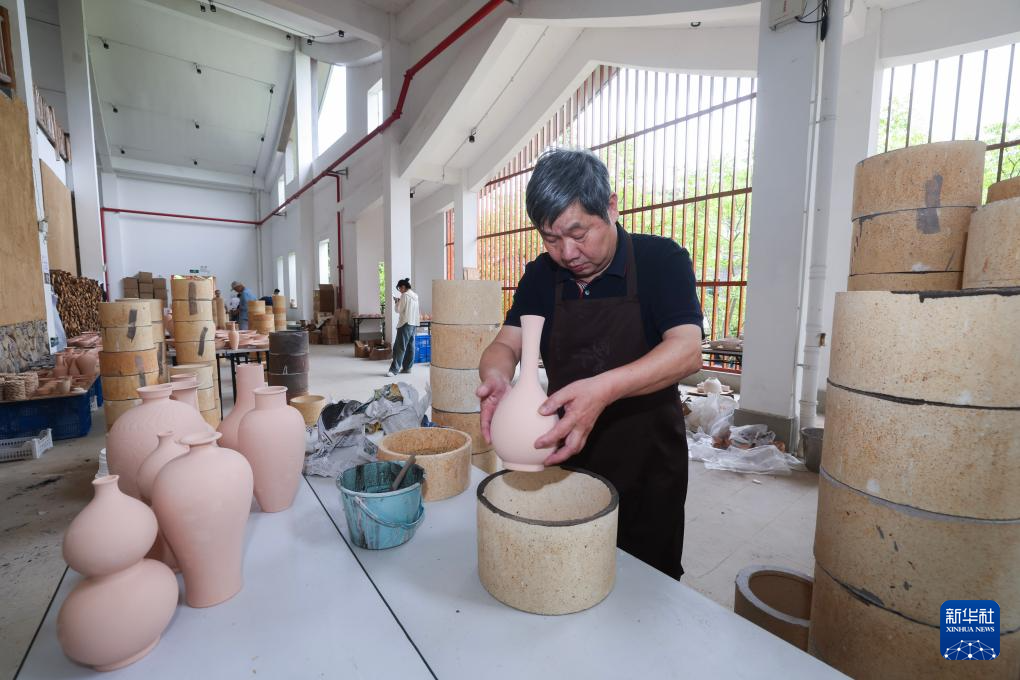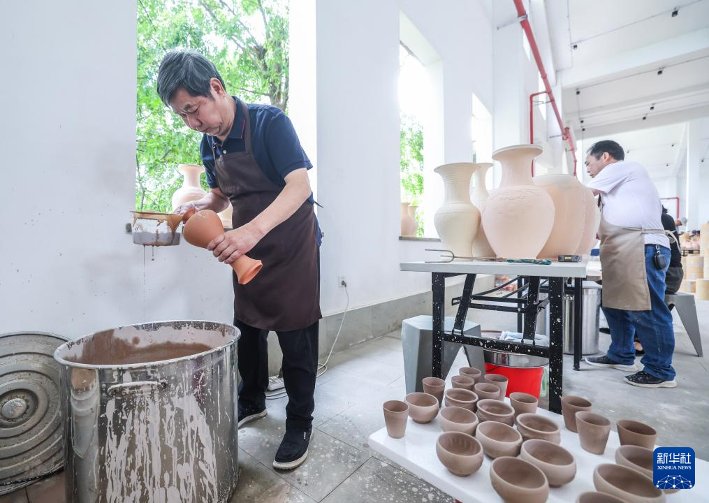 5月29日,中国陶瓷艺术大师、浙江省非物质文化遗产越窑青瓷传承人孙迈华在龙窑旁给瓷坯上釉。