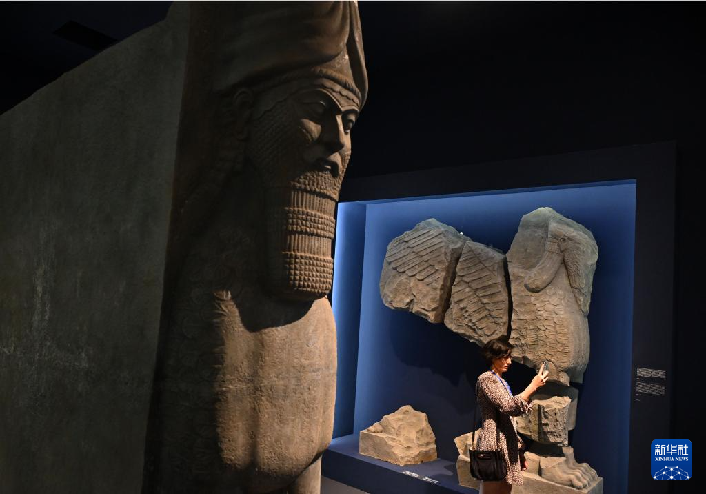收藏于摩苏尔博物馆中的拉玛苏雕塑遭到破坏后碎裂为数百块残片。左为拉玛苏雕塑的仿制缩小件,右为根据摩苏尔博物馆提供的三维数据制作的拉玛苏雕塑残片(6月6日摄)。