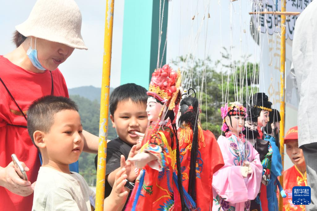 6月8日,在浙江省建德市博物馆水秀广场,小朋友在非遗项目展演活动中体验提线木偶。