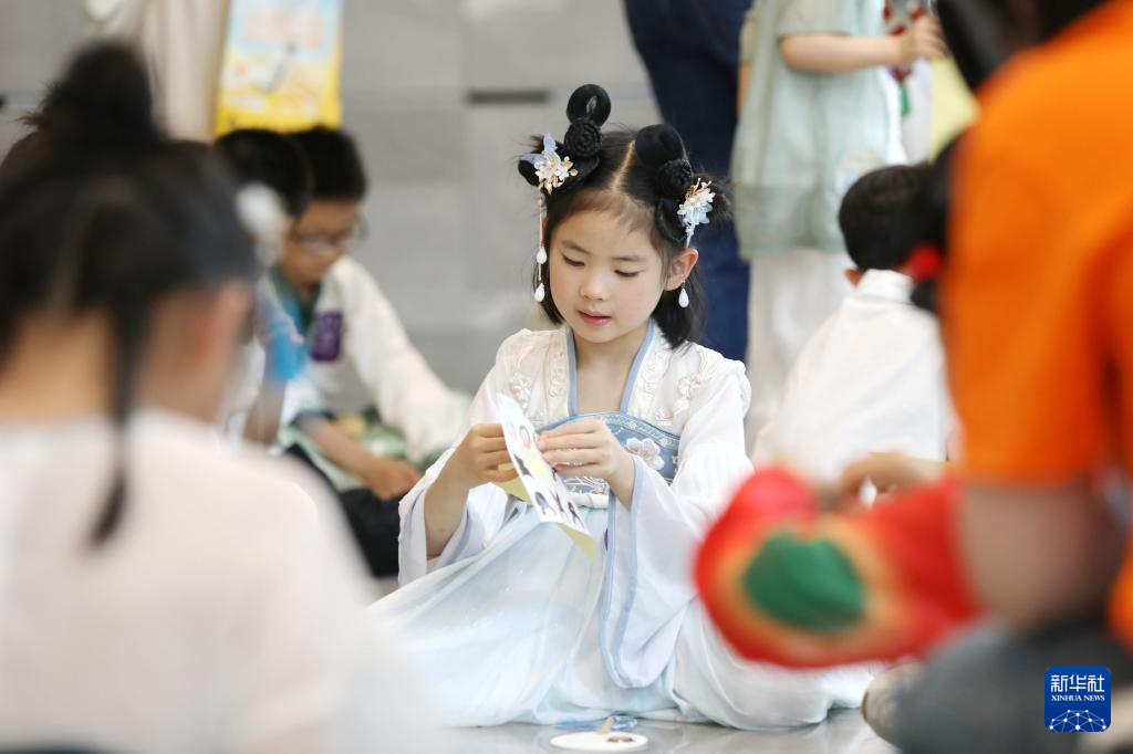 6月8日,小朋友在河南省洛阳市老城区体验制作古代服饰。
