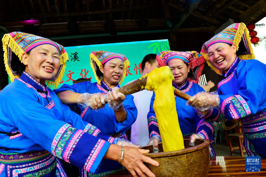 6月10日,在广西富川瑶族自治县朝东镇福溪村,身穿瑶族盛装的村民进行民俗活动打“冻糍”。