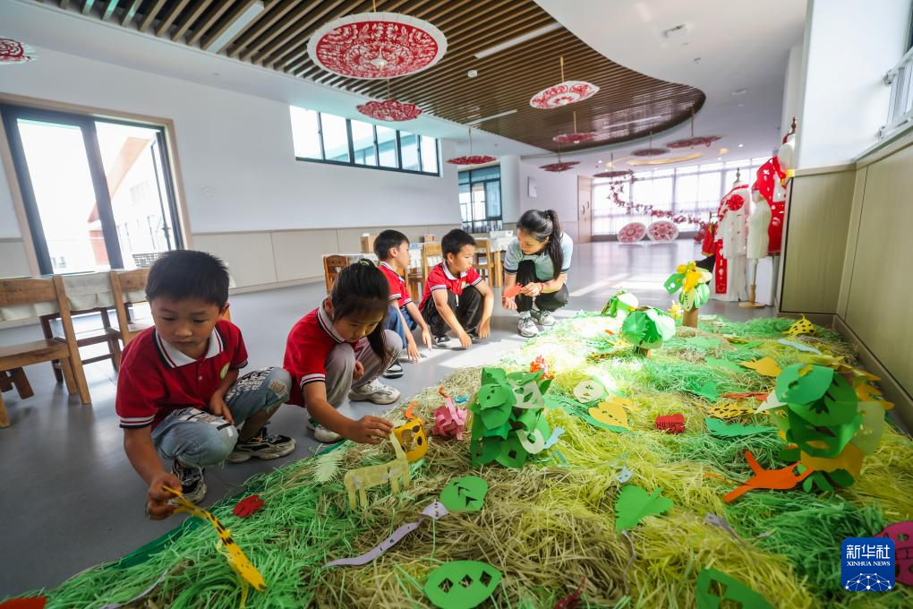 这是老师和孩子们用废旧报纸及包装纸制作的创意纸艺作品(6月13日摄)。