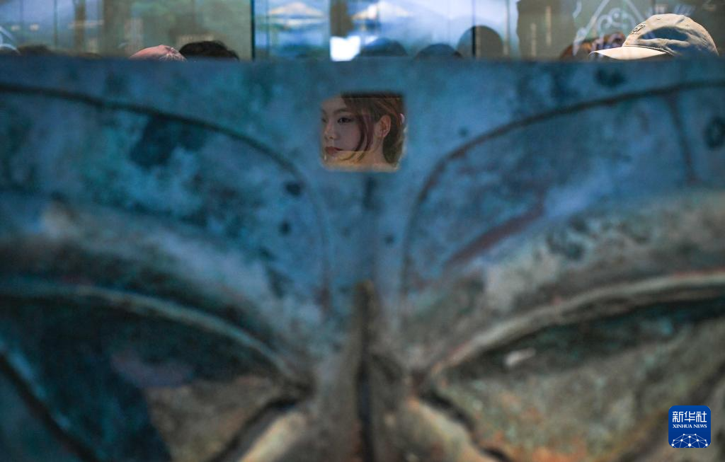 6月27日,观众在观看展品“戴冠纵目青铜面具”。