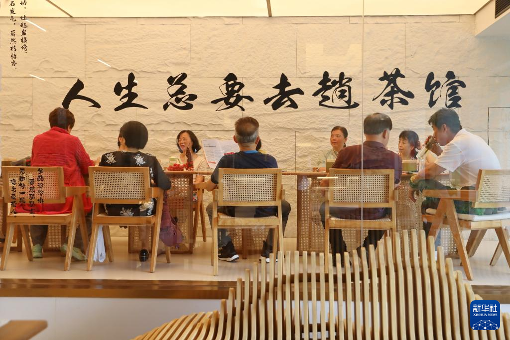 6月29日,游客在芦席汇历史街区一家茶馆内喝茶休闲。