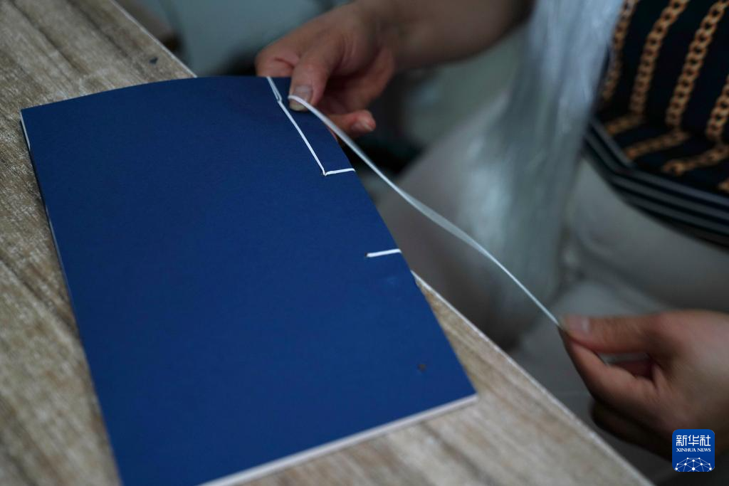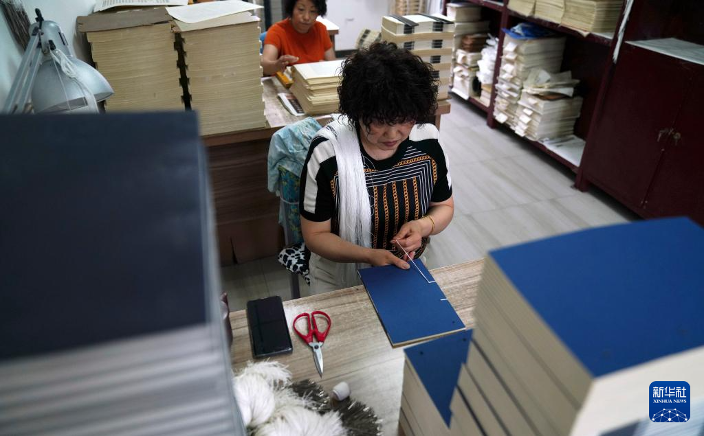 6月27日,在金陵刻经处技艺展示区,工作人员在手工装订图书。