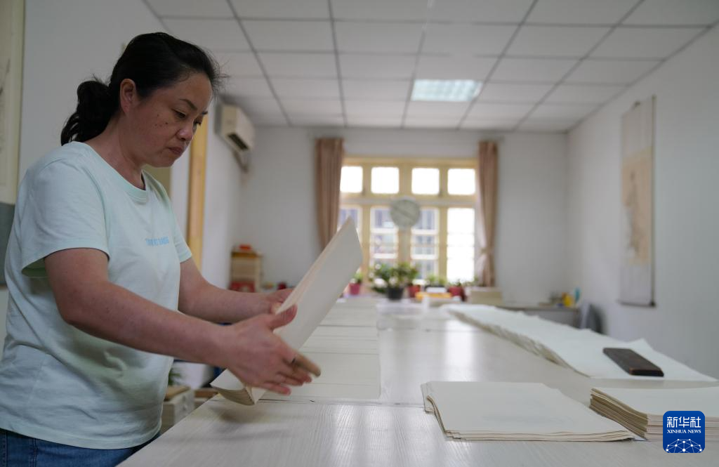 6月27日,在金陵刻经处技艺展示区,工作人员在分页。