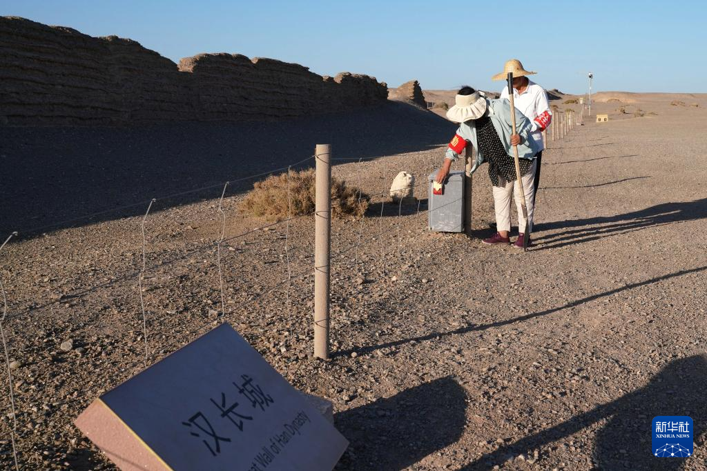 7月16日,张吉全和闻春瑜夫妇沿着汉长城巡护时加固防护栏。