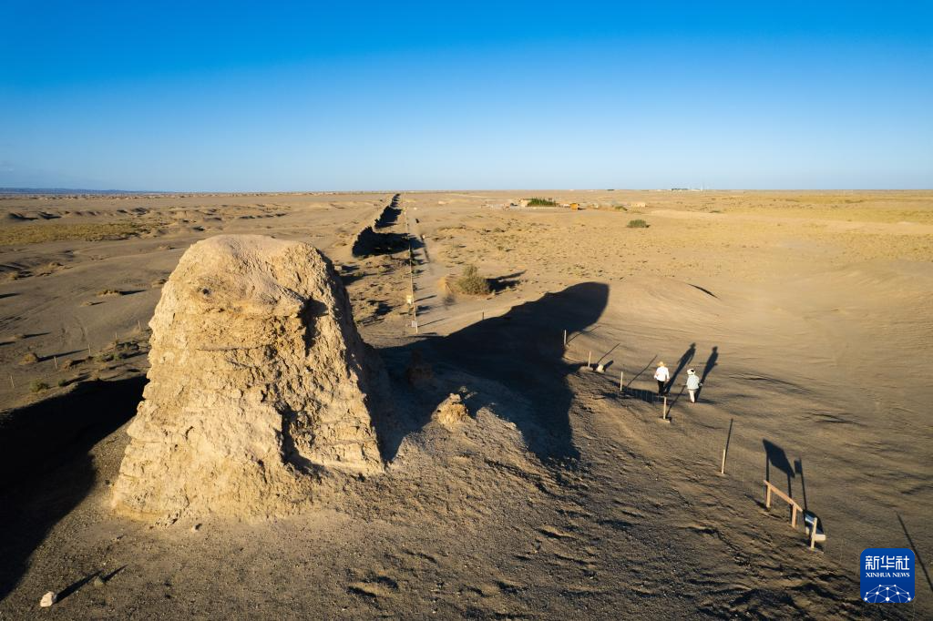 7月16日,张吉全和闻春瑜夫妇沿着汉长城巡护当谷燧(无人机照片)。