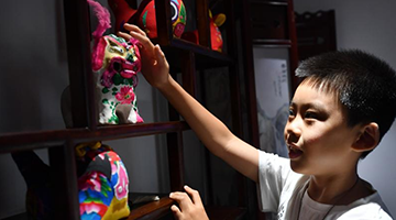 7月19日,邱恒勇展示他创作的木活字印刷的百福图。