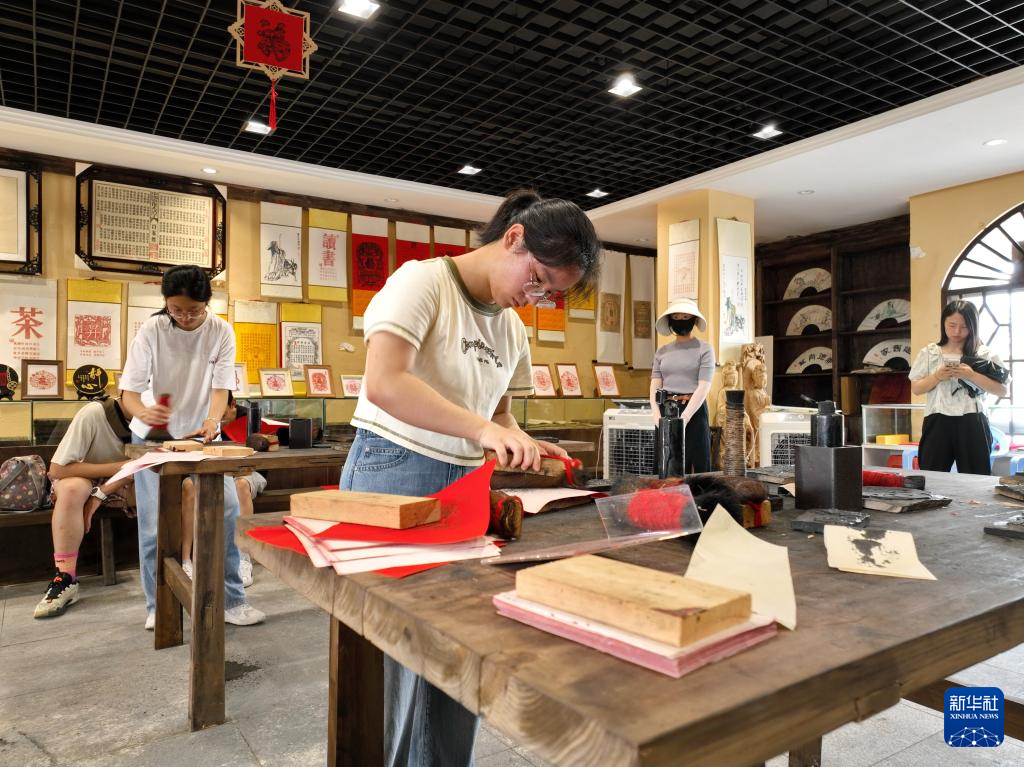 7月18日,游客在宁化石壁客家祖地文化园的木活字印刷传习所体验木活字印刷技术。