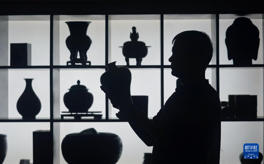 在位于江西省景德镇市善窑厂展厅里,李善明在欣赏一件天青汝釉瓷瓶(8月28日摄)。