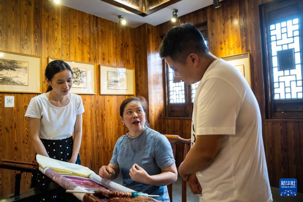 9月3日,在常德河街,桃源刺绣非遗传承人罗明华(中)向游客讲解刺绣技艺。