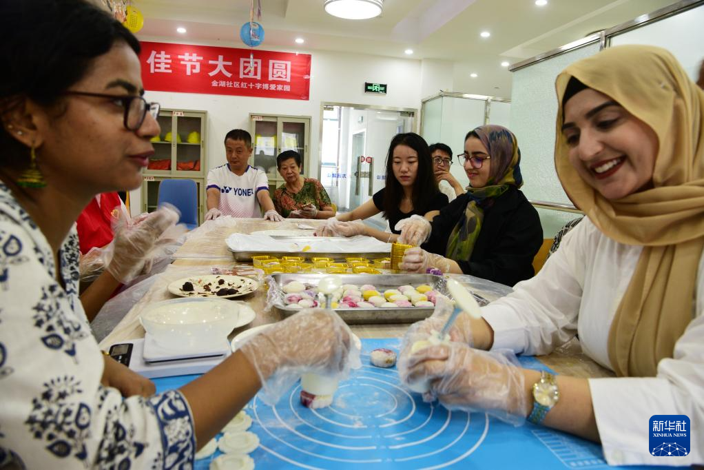 9月11日,在江苏省镇江市金湖社区,江苏大学的外国留学生和居民一起制作月饼。