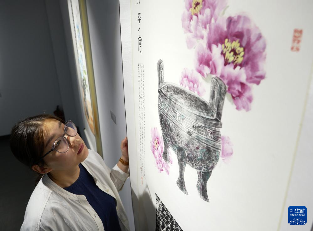 在洛阳华夏金石文化博物馆,钱夏玉在观看金石博古画成品(9月11日摄)。