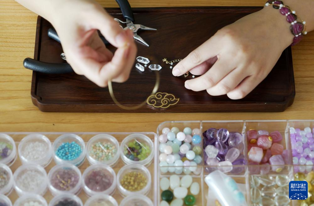 楚蒙丹在位于洛阳市的非遗体验馆里制作辑珠饰品(9月12日摄)。