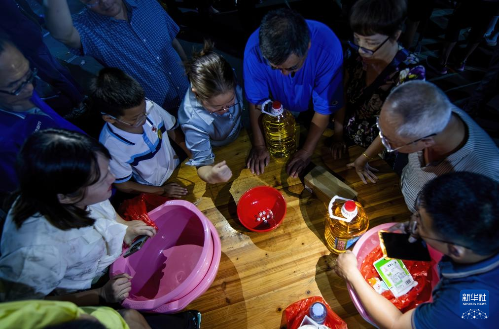 9月14日,在福建厦门一小区内,老少居民一起参加博饼活动。