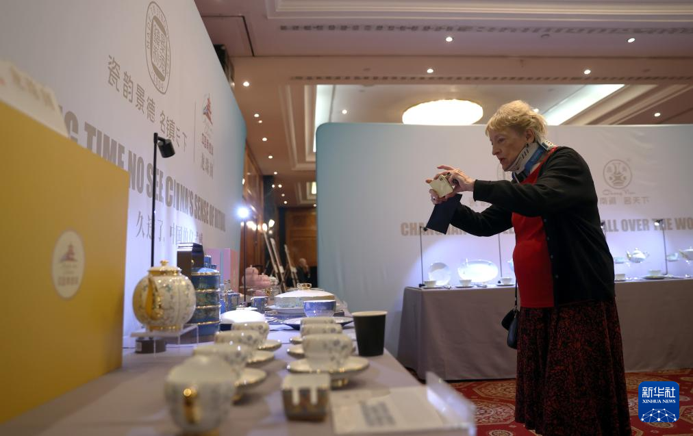 9月17日,在英国伦敦,一名女子在 “天涯共此时——景秀China”景德镇文化和旅游宣传推广活动上拍摄景德镇瓷器。