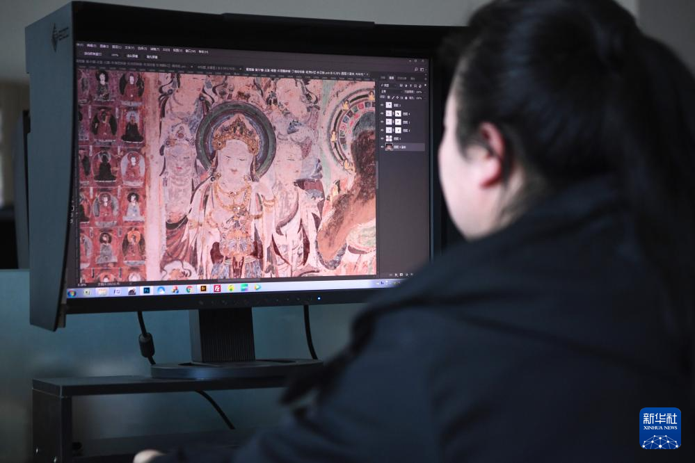 2023年4月25日,敦煌研究院文物数字化保护团队图像处理人员年海丽在拼接壁画图像。新华社记者 陈斌 摄